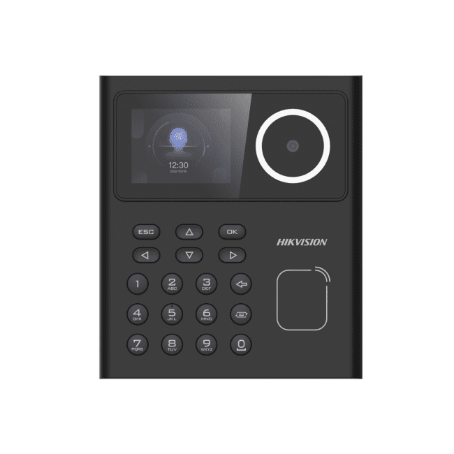 Терминал доступа Hikvision DS-K1T320MX с распознаванием лиц укомплектован считывателем карт формата Mifare, аналоговой камерой разрешением 2 Мп, дисплеем диагональю 2.4".