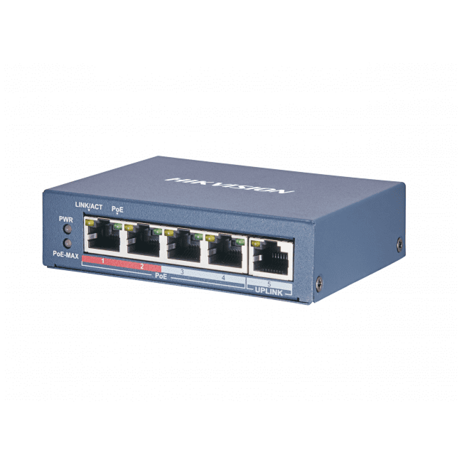 Неуправляемый PoE-коммутатор Hikvision DS-3E0105P-E (B) укомплектован четырьмя FE-портами RJ-45 с PoE и двумя GE-портами RJ-45. Подает на порт РоЕ до 30 Вт при общем бюджете 60 Вт. Поддерживает два приоритетных порта, гарантировано получающих питание при превышении нагрузки выше допустимого значения.